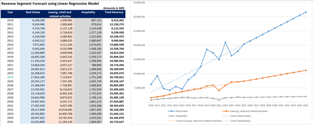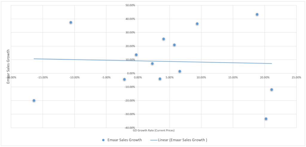 Next, I explored the idea of correlating EMAAR’s sales with the UAE’s GDP growth rate. It’s a solid concept—sales should, in theory, grow with a booming economy. But guess what? The correlation was weak, rendering this approach unusable.